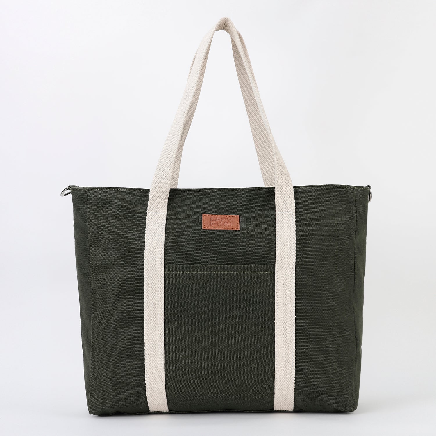 Olive Tote Bag, is perfectly blend with simplicity. It is made from cotton canvas material, with adjustable straps with space of 14.5” x 15.5” x 3.5” design. It is unisex. This this sleek bag is your ideal companion for office work, business trip or casual outings . Carry it with style.